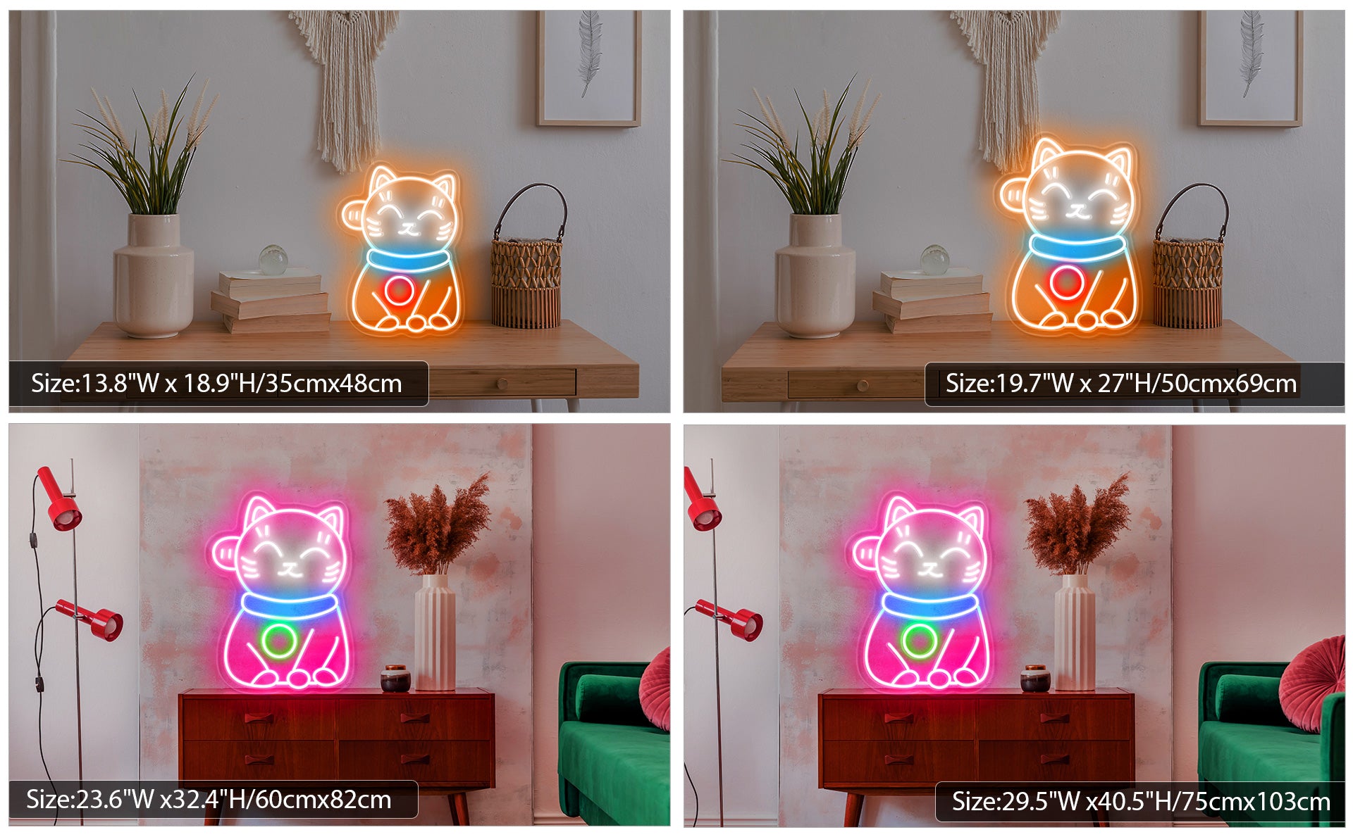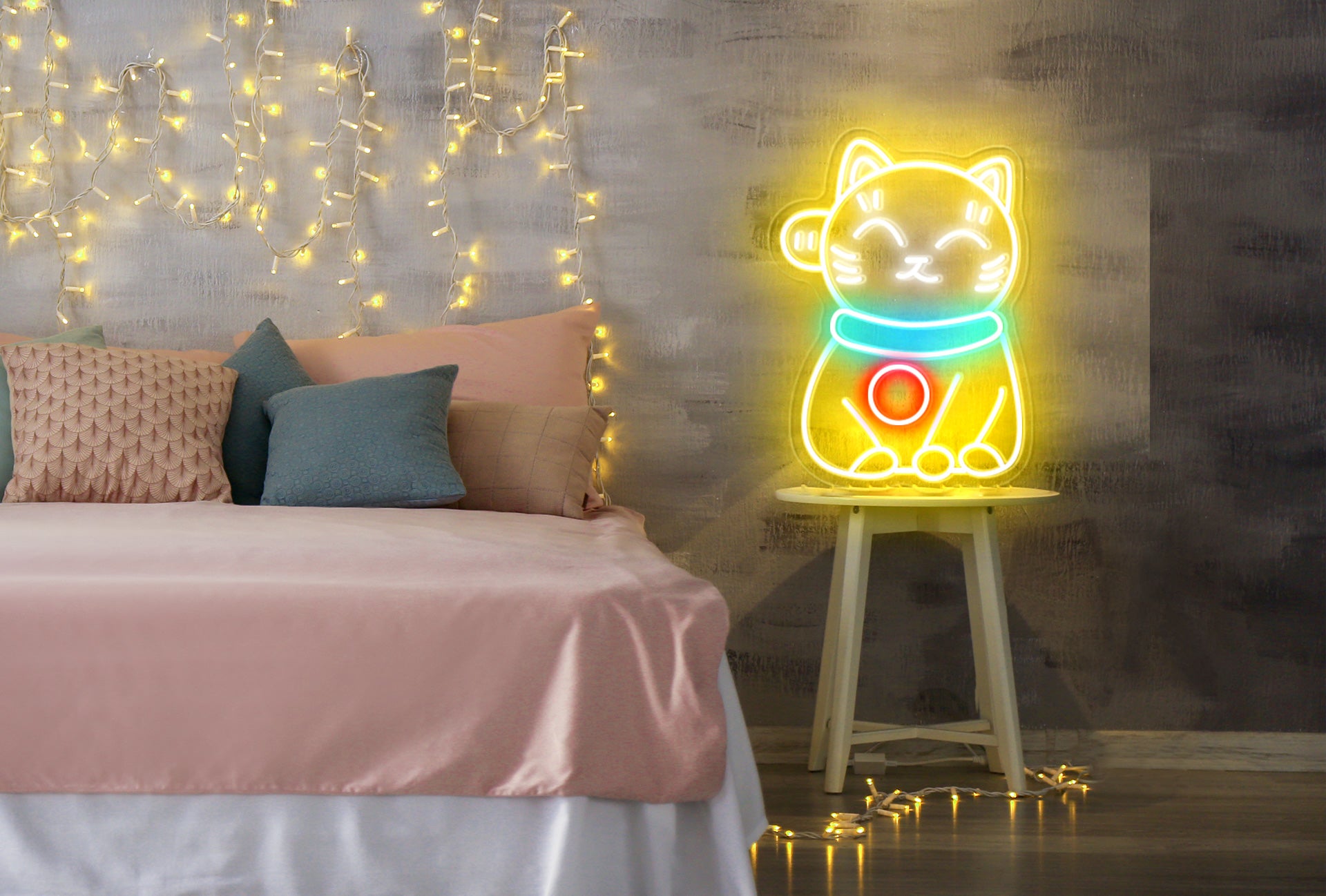 Bring good luck and happiness to any space with our Lucky Cat Glowing Neon Sign. With customisable colors, this unique and durable sign is sure to catch everyone's eye and start conversations. Easy to install, affordable, and safe, it's the perfect addition to any home or business. Adorable and loved by all, this sign is a must-have for a cute and happy atmosphere.