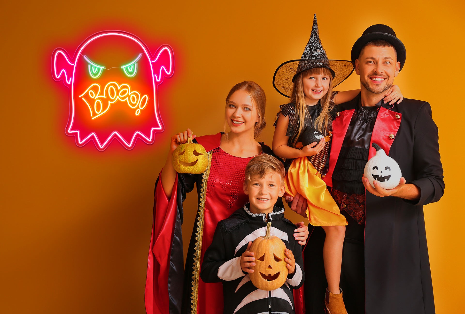 Custom glowing Cute booo ghost lights decorate your Halloween day, This very cute neon light is a good choice, Choose your favorite Halloween neon sign, if there is no style you like, you can upload a picture or file to us, we provide free quotes and designs.