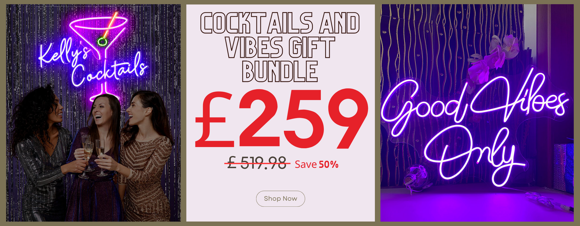 Introducing our exclusive Cocktails and Vibes Gift Bundle - the perfect present for those who love to mix up drinks at home. This fabulous package showcases a stunning 65cm Custom Name Cocktail Bar Sign, carefully crafted to bring a touch of personalised sophistication to any kitchen or bar area. As an added bonus, we are thrilled to include our equally mesmerising 65cm Good Vibes Only Neon Sign, serving as a constant reminder to embrace positivity and create an inviting ambiance.