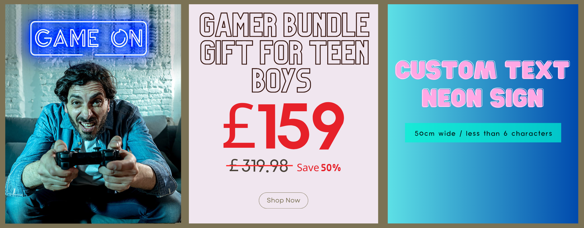Introducing our Gamer Bundle Gift for Teen Boys, meticulously designed to elevate their gaming experience and let their individuality shine. This extraordinary package includes a dynamic 50cm Game On Neon Sign, instantly creating an electrifying gaming ambiance. As a special bonus, we've included a remarkable 50cm personalised neon sign, allowing them to proudly showcase their unique identity.